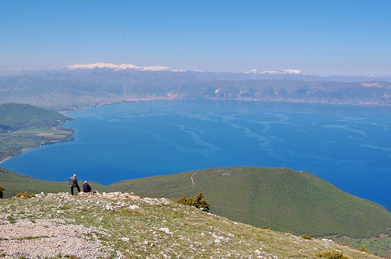 Climb to the highest point in the park for the best views over both lakes and into the Albanian and Greek mountain ranges.